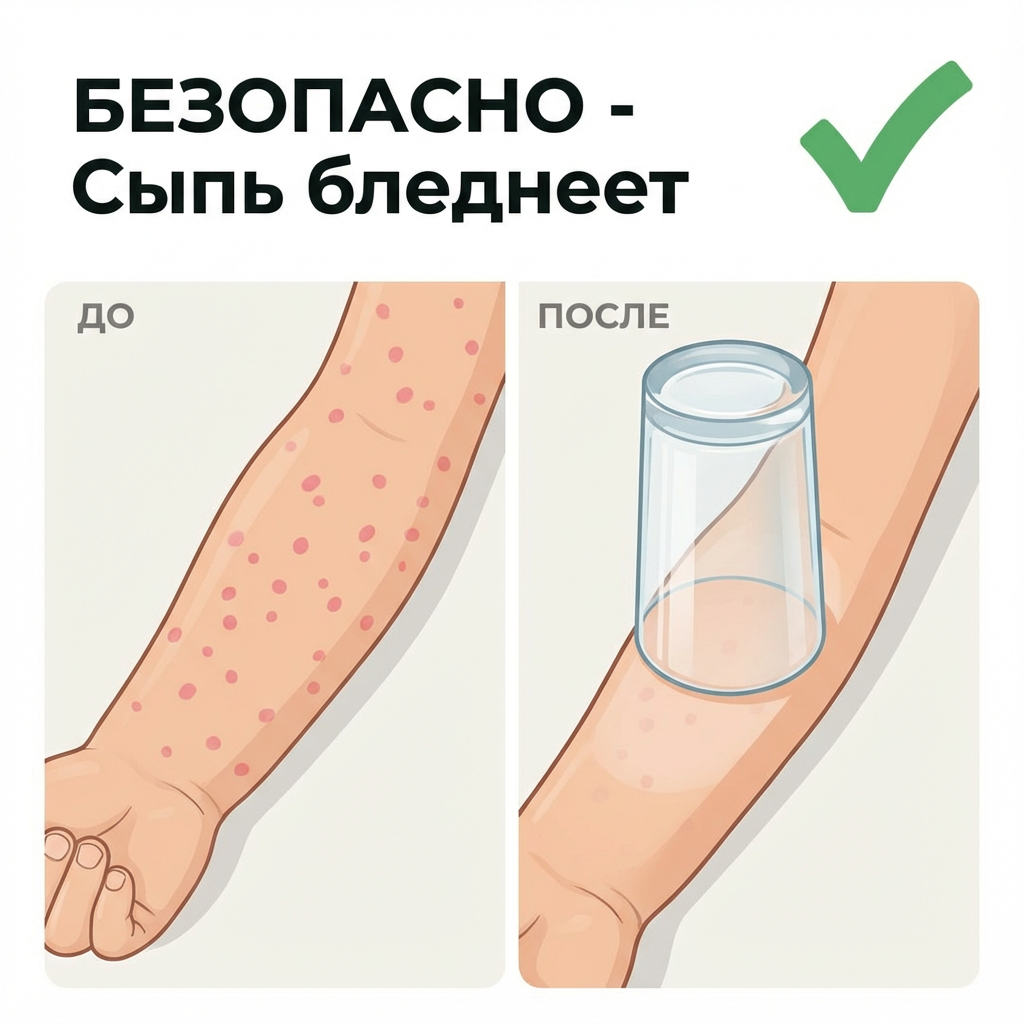 Безопасная сыпь (бледнеет): Вызвана расширением поверхностных капилляров. При надавливании кровь выдавливается из сосудов → сыпь исчезает.